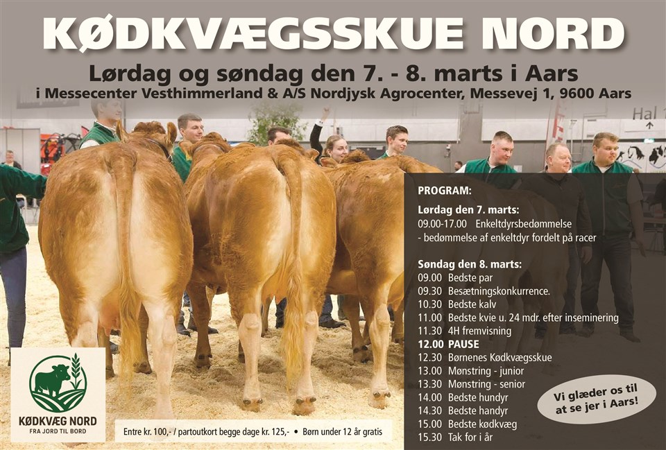 Tag hele familien med til Kødkvægsskue Nord i Aars når Kødkvæg Nord åbner til 2 dage i kødkvægets tegn. Kom og se stalden fyldt med kødkvæg samt maskinudstilling i hal 2, smagsprøver samt sjov for børn.