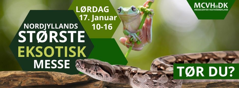 Exhibition centre Vesthimmerland is hosting the biggest exotic exhibition in North Jutland. This includes everything from snakes, lizards, spiders, tortoises, frogs, insects and birds, as well as rodents, exotic mammals, aquarium, animal feed and equipment.